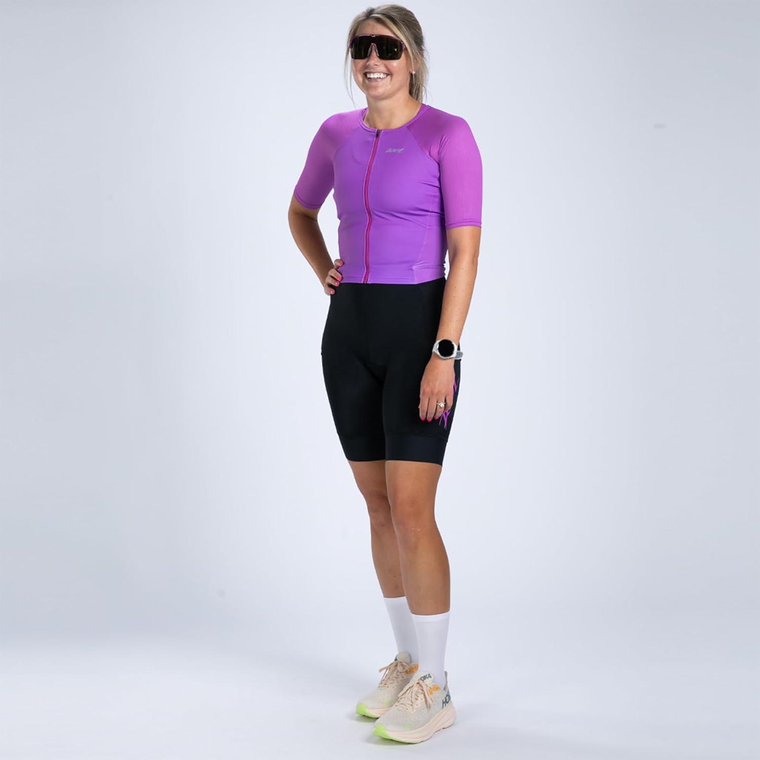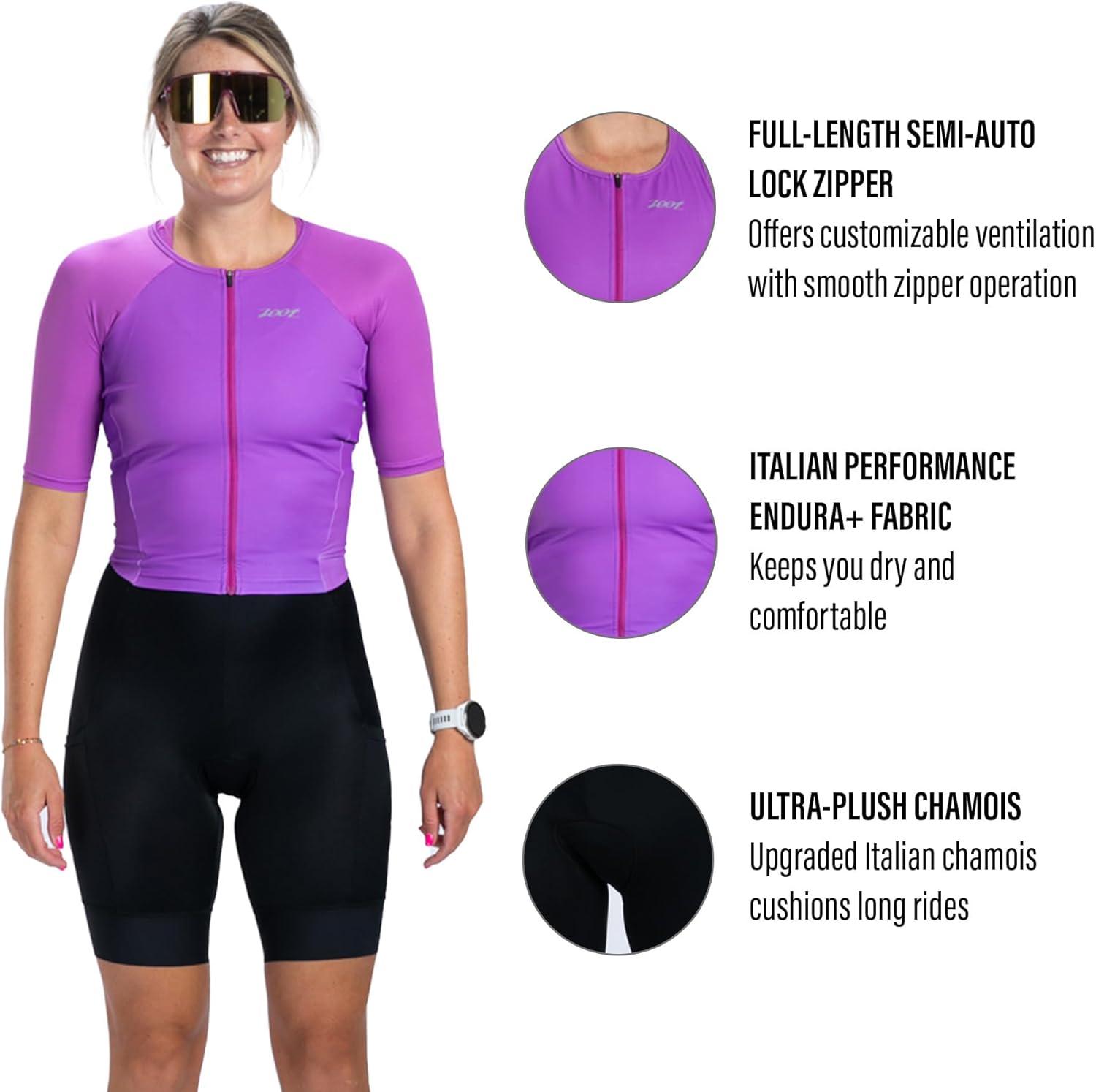 Zoot Women’s Core Tri Aero FZ Racesuit, Short Sleeve Moisture-Wicking Triathlon Suit, Plush Chamois & Race Day Storage(Deep Purple)